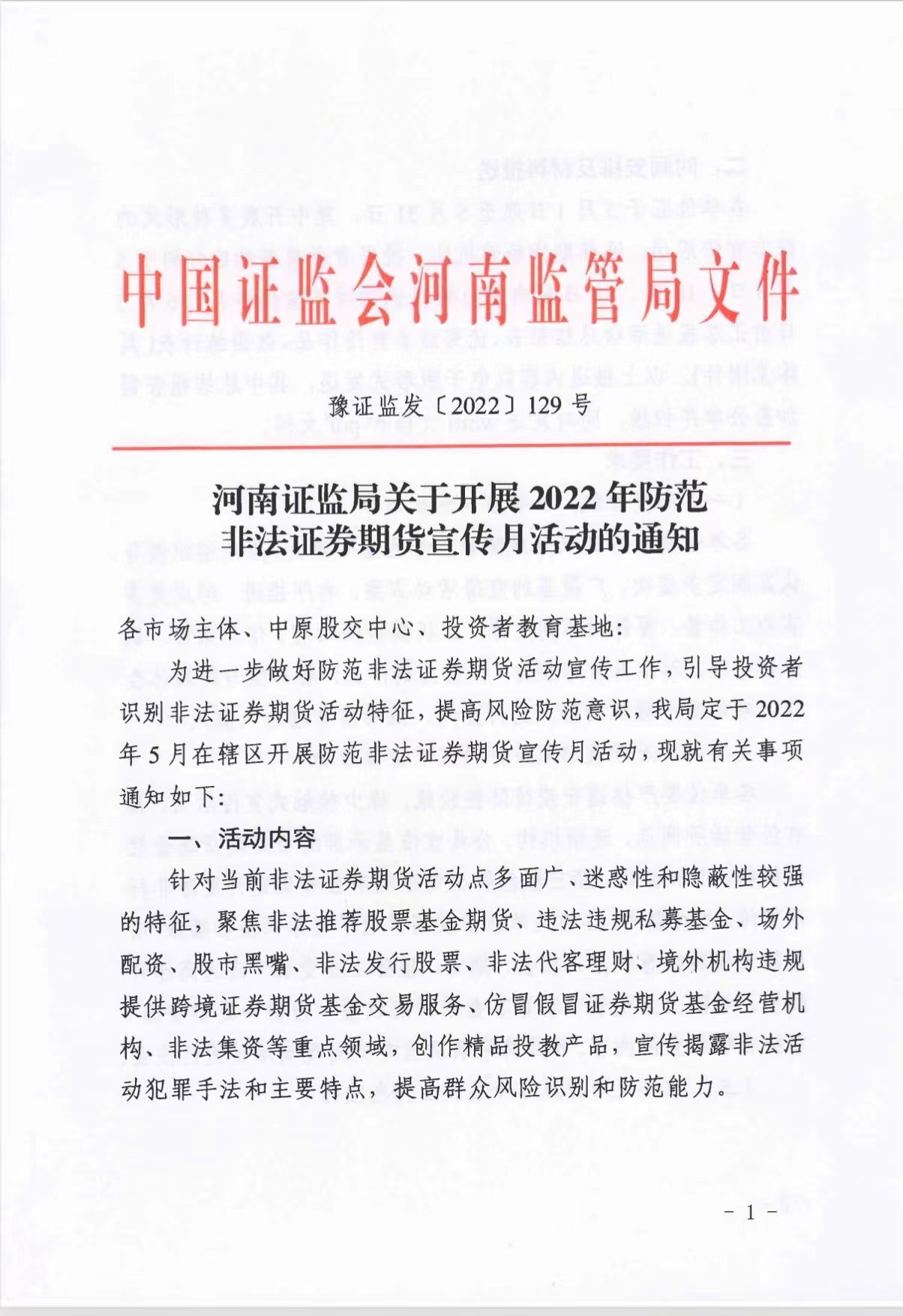 河南證監(jiān)局關(guān)于開展2022年防范非法證劵期貨宣傳月活動(dòng)的通知